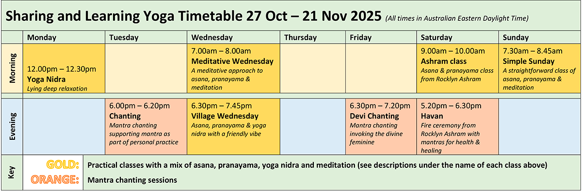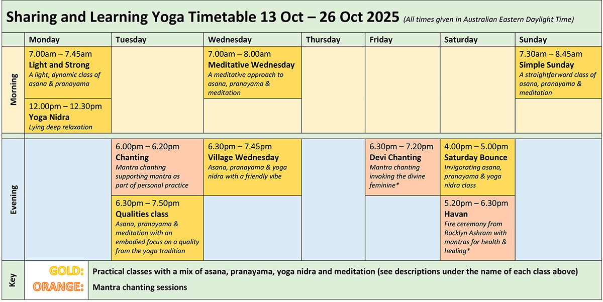 Note not all classes in all weeks this term. Additional classes run during 3 week course - What I like about Yoga from November 22. See timetables below class list for details and times of classes.
